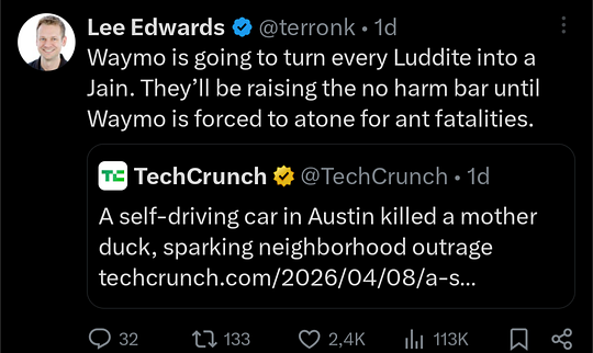 Way too many people would prefer thousands of deaths in the abstract of stats over empty cars in the concrete of the streets. It's too easy to let small, immediate empathy overshadow the big, distant kind; a lightbulb is not brigther than the sun just because it's closer. We should be able to shut down the visceral reaction of watching a car drive solo for the sake of not having to read as many obituary sections that look like accident reports.