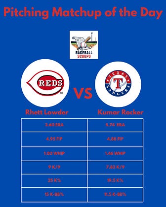 Rhett Lowder makes his second start of the season for the Reds. Kumar Rocker makes his first start of the season for the Rangers.