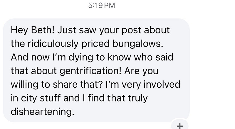 Advice on how to reply to the woman who said she can’t wait for my old town to be fully gentrified and is now running for mayor? She’s in my inbox acting like she doesn’t know I’m talking about her