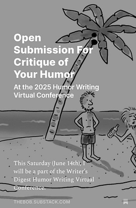 Oh, it's happening. This Saturday I am taking part in 2025 Annual Virtual Humor Conference. I will provide a brief critique for the first 15 signups.