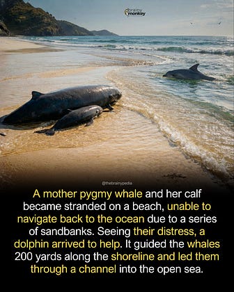A remarkable rescue took place in New Zealand when a dolphin named Moko helped save a stranded mother pygmy sperm whale and her calf. According to The Independent, the whales had become trapped by a series of sandbanks at Mahia Beach in 2008 and were unable to find their way back to the ocean despite repeated attempts.