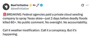 JFC, I got an email from a fact checker about whether cloud seeding could have caused the Texas floods. The answer: cloud seeding is (almost always) a scam. For many many many reasons, it is not responsible for the flooding.