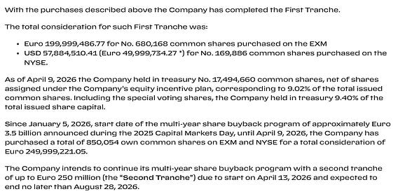 Ferrari’s completed the first tranche of its 3.5 billion EUR buyback program. So logically, it's now started the second tranche :)