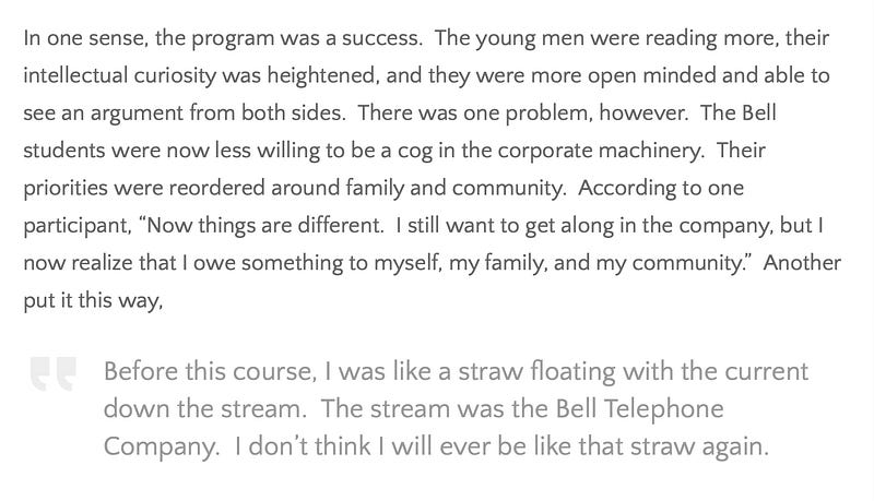 I was recently reminded of a post I wrote back in 2010 about a program for humanistic education for corporate managers run by the Bell Telephone Company of Pennsylvania back in the 1950s. It didn’t end well. thefrailestthing.com/20…