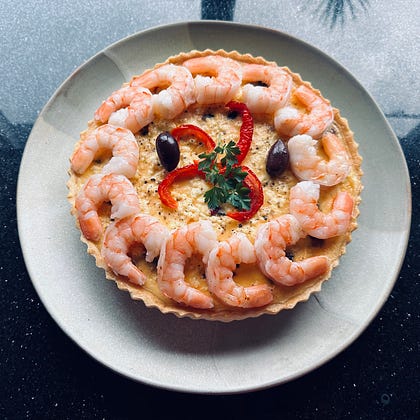 Making sense of what is left behind at the end of the day. Picking out the good bits and offering them another life. I’ve made a prawn quiche/tart.