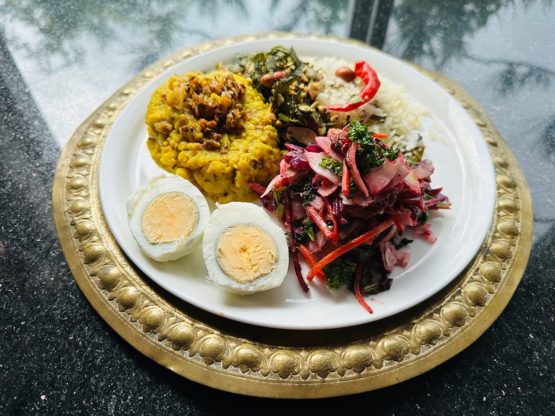 Into the pan goes a splash of oil, a teaspoon of ginger- garlic paste ( available in Indian grocers), ¼ teaspoon of asafoetida- hing (see Indian grocer, or omit), some salt, coconut and a sprinkle of salt. Quick stir through on the stove, and it’s ready. The rice, dahl were leftovers, I always have boiled eggs in the fridge and finished with some of my devilled curry leaf Dukkha ( see my last post for this).