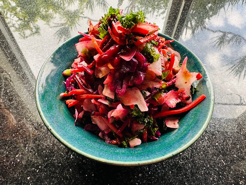 I want to show you how easy this was. A packet of kale salad mix with slithers of beetroot and carrot.