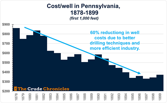 The first drillers of Western Pennsylvania used to use percussion rigs that would drop a chisel like bit on the rock to smash it. Roustabouts would clear the well and they would do it again. But then came the introduction of rotary rigs and other advancements. Voila! A capital efficiency cycle.