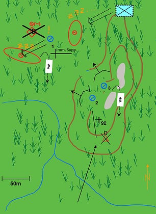 Once we have broken contact, we will regroup the squad on the S side of the creek directly S of hill 92.