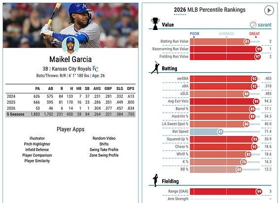 Maikel Garcia does not get the attention he deserves. One of the most improved players last season, wins the WBC MVP and starts off 2026 like this: