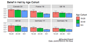 Among all native-born respondents (not just the religious), younger respondents in several thoroughly secularized societies are more likely than their parents and grandparents to report that they hold basic Christian beliefs like Heaven and Hell. No one’s out of the woods, but this has big consequences for the resurrection of the faith in lands where Christianity was said to have died off.