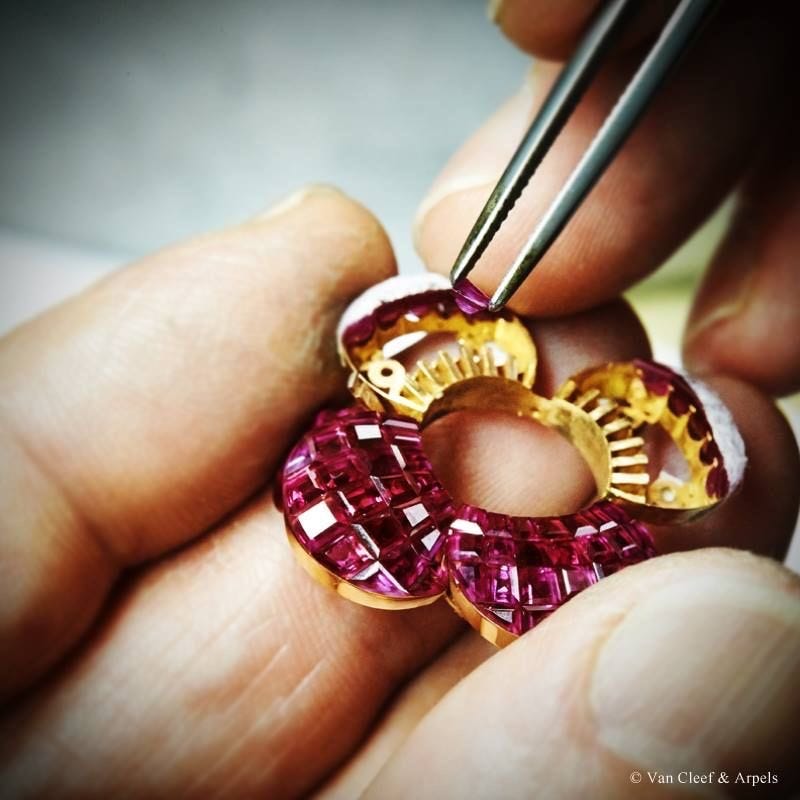 Each stone is cut with tiny grooves on its sides and is slid onto a hidden lattice of gold rails underneath so the stones appear to float 💎