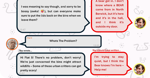I love the fearless way the Good Eggs take on prompts at our writing groups or in the newsletter. This piece by George Prew-Stell is a lot of fun based on ‘messages you should have sent’. Give it a read! 🙌🧸