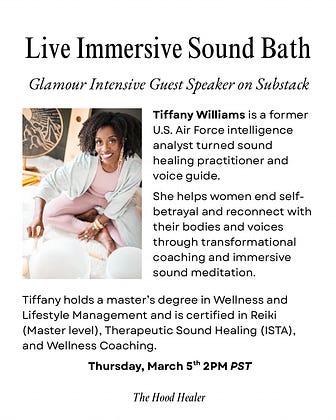 Tiffany Williams is a former Air Force intelligence analyst turned healer, with a background in Wellness, Reiki mastership, and therapeutic sound healing. She will be graciously sharing a live immersive sound bath experience for us on Substack tomorrow, March 5th at 2PM (PST), as well as a guided vocal activation.