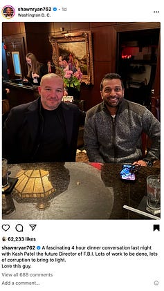 Ex-SEAL Shawn Ryan (aka Sean Palmisano), who by his own account spent years in Colombia building cocaine networks, says he spent four hours talking corruption with Kash Patel, Trump’s pick to run the FBI.