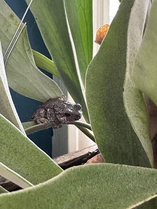 My frog friend, who I haven’t see since Feb. 8, made an appearance yesterday. Apparently she’s still living in the houseplants and I guess she’s finding enough to eat because I swear she’s bigger.