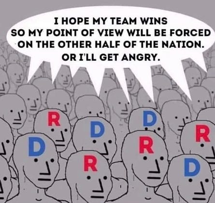 Statism exists because of the belief in it and it rules by force, coercion and theft that one man should be fit to control another. No side wins because big brother tightens the noose on the population with each (s)election. The illusion of red or blue as your only choice in life removes the other vast possibilities for living, for liberty. Allowing a “majority” to choose how you should live your life as a minority of one is absurd. A land that charges you for rain water, suffocates and censors you for not doing as told by a bully does not care about you or who you vote for, only that you maintain the belief in their religion disgused as “for the people.” You can’t vote your way to freedom, it’s an oxymoron. Rights do not come from government. Solutions to problems created to sell the solutions is not about helping anyone, it’s about manufacturing fear to keep the emotions high and critical thinking low.