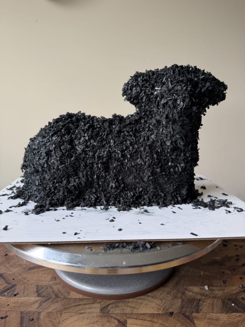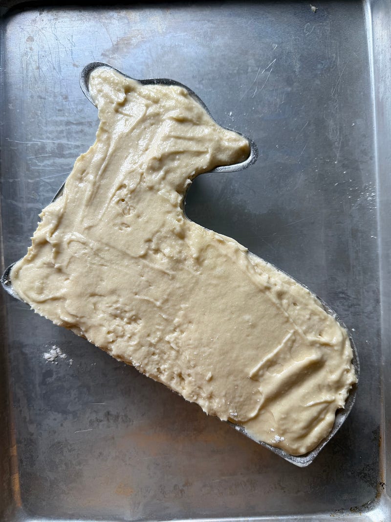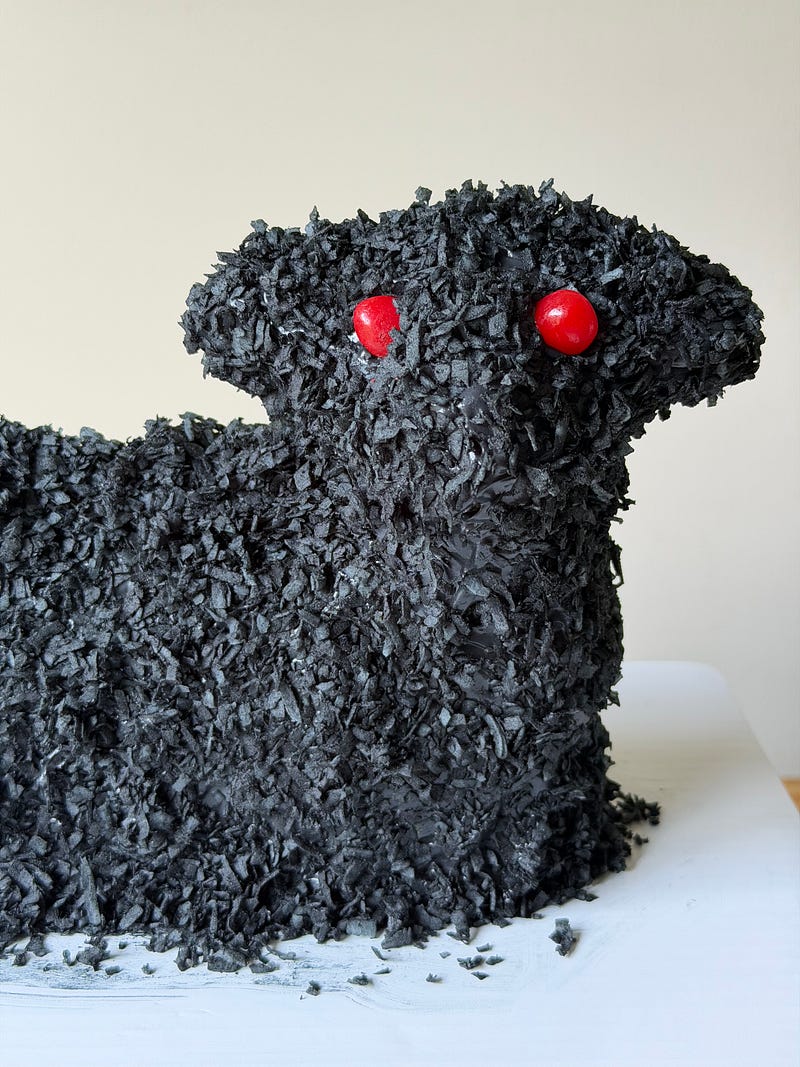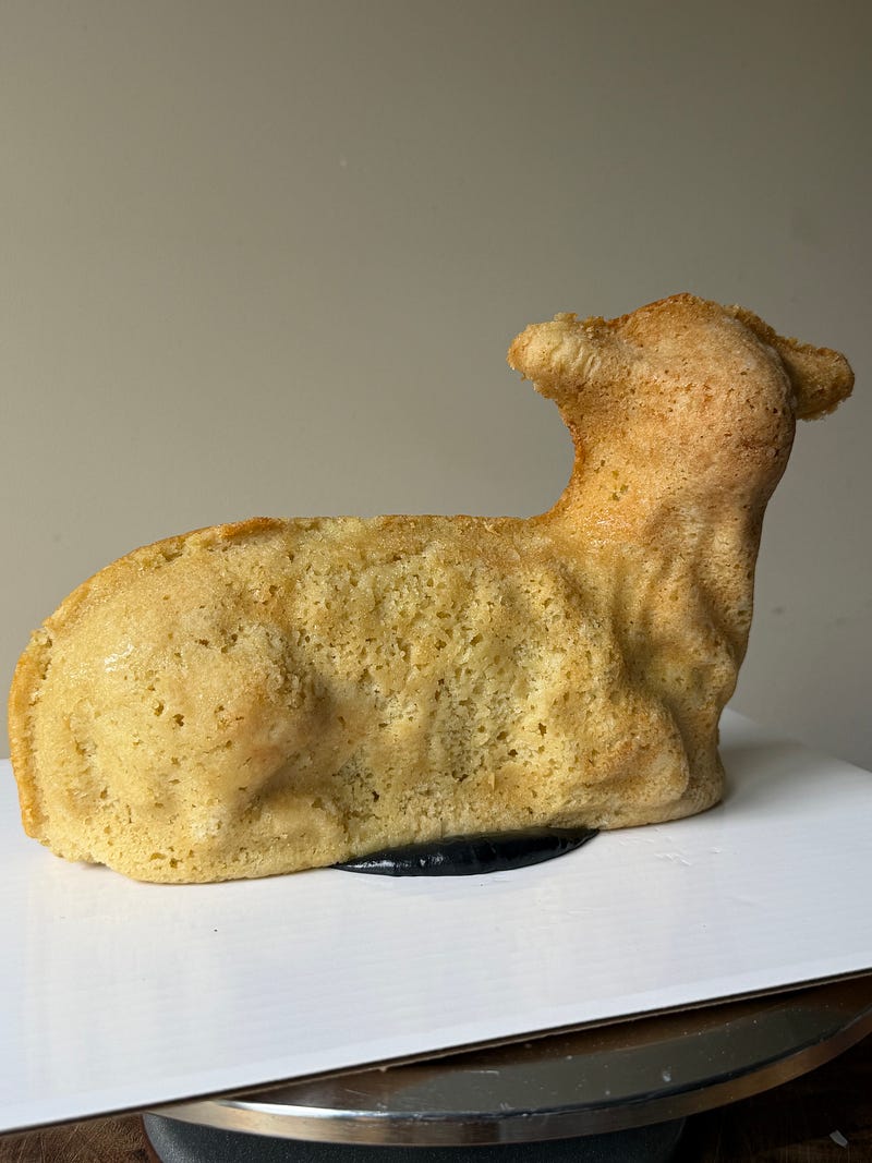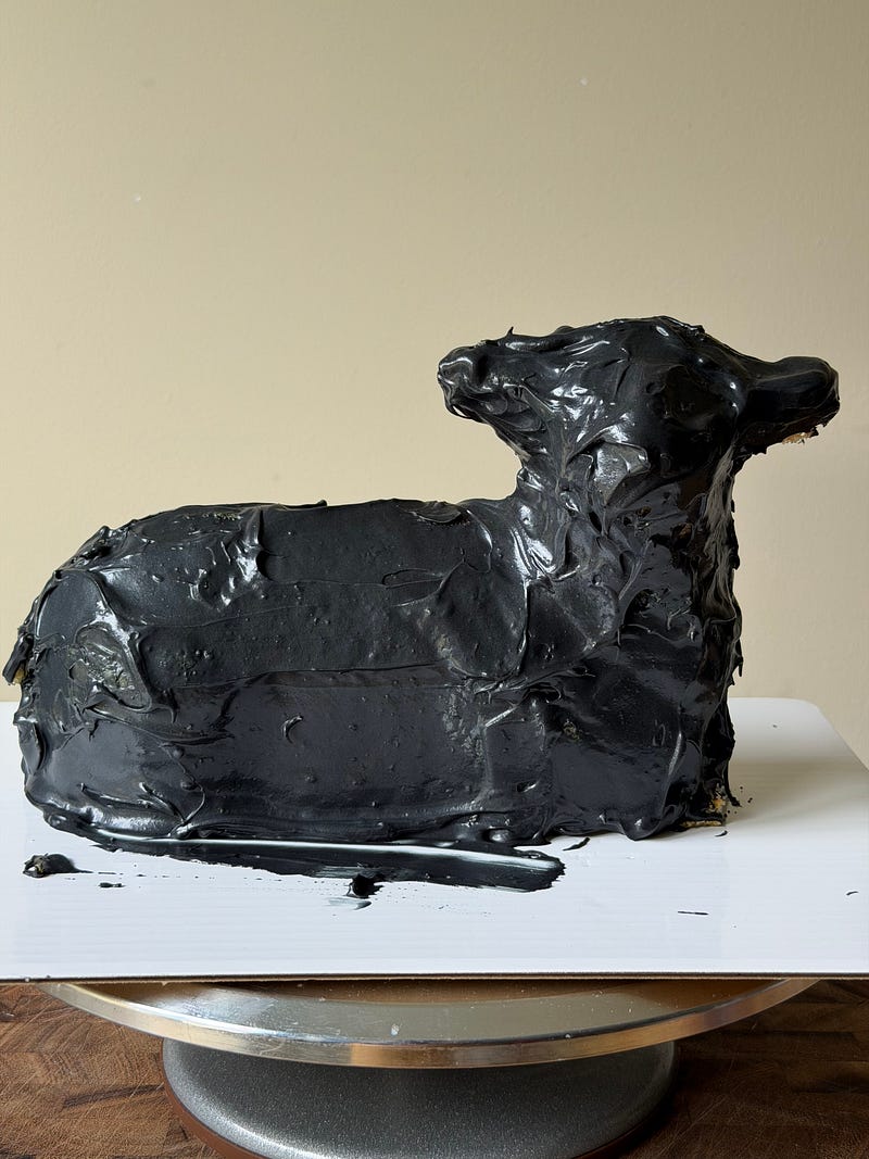 Evil lamb cake for Easter! A vanilla cake covered in leftover lemon cream cheese frosting and coconut flakes