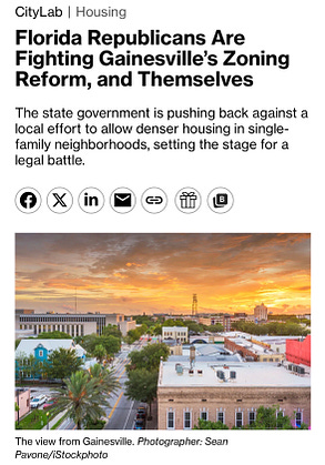 An interesting case study illustrating how state preemption of local housing laws can backfire: State Republicans in Florida successfully fought to reverse modest zoning reform in Gainesville!