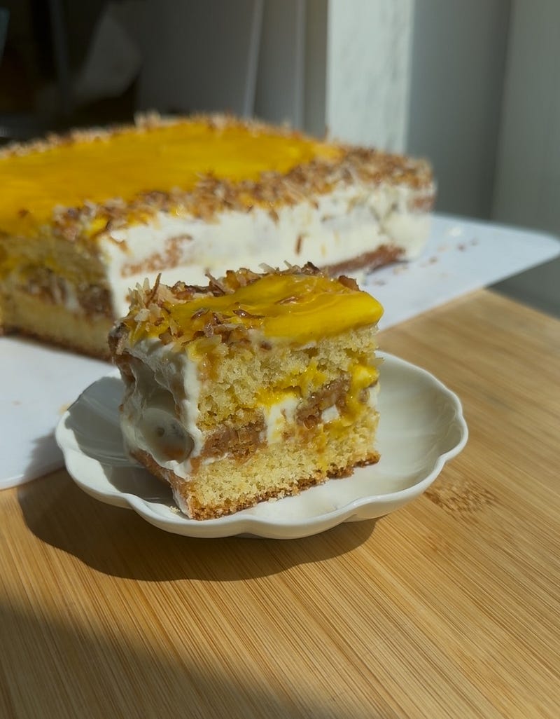 Coconut sponge cake with mango curd, dulce de leche macadamia nut feuilletine filling and mascarpone whipped cream. Yes. A bake off winning recipe by @chucksbakes!