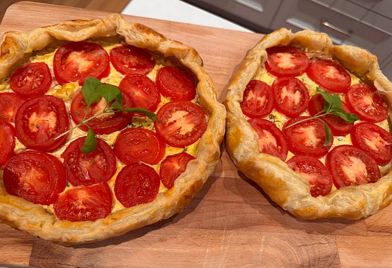 Football playoff season. My guys’ energy level is up, stat-focused, waiting to see the next team to make it, the next one to fall. Instead of pizza, I elevated the food game for our home team show and made a couple of tomato galettes garnished with lemon basil sprigs from my indoor garden. Comment if you’d like to know how to make them!