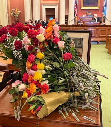 When Minnesota lawmakers returned to the Capitol today, single roses appeared on the desk of every House member. Soon, all the roses were piled on Melissa Hortman's empty desk where she served as speaker for six years until she, her husband, and her dog were murdered by a right-wing extremist on June 14, 2025.