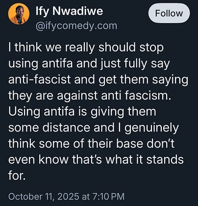 absolutely. Use the full phrase. It does create distance to say Antifa, because the way it’s pronounced, doesn’t sound like the words Anti or Fascist.