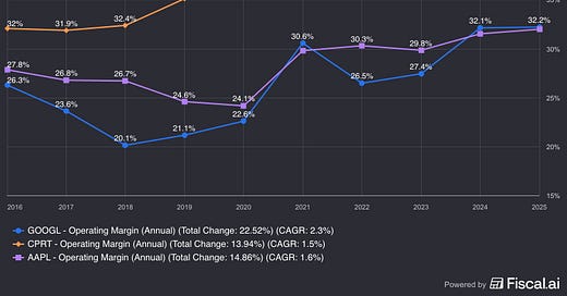 The result? A massive expense line (rent) simply doesn’t exist on Copart’s income statement. The 750 basis point spread between Copart and IAA isn’t a quality-of-earnings concern. It’s a quantification of a multi-decade moat.