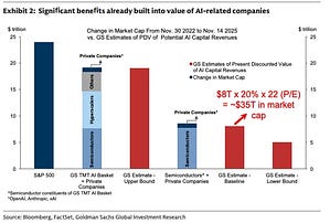$35T > $24T, leaving ~$11T in market cap gains, yet to be captured by current prices. That’s $11T in equity value lying on the table, based mostly on revenue assumptions from the AI build-out itself, i.e. the money that the hyperscalers are spending, and less-so the money that will be spent on the hyperscalers by their customers.