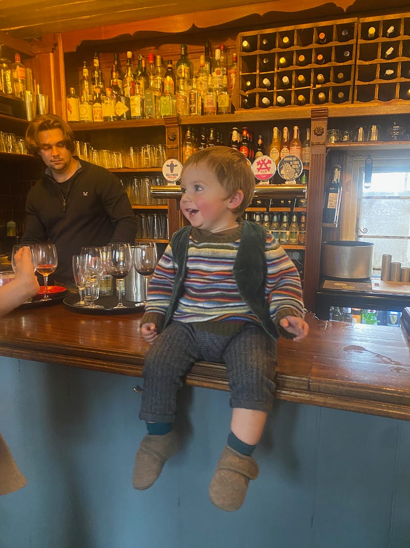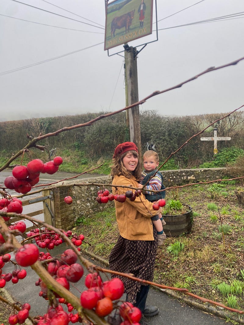 Hobby’s first pub lunch on a wild and blustery day on the Downs! We’re back in California now turning towards the sun like the first daffodils of Spring. Oh, that warmth and the ruby flush on our cheeks after our first day in the sun in almost a month. It feels good to be home this time