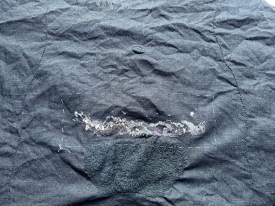 Alt text: The lower torso and hips of a woman are outlined in black thread on wrinkled black linen, and the belly button is stitched in black satin stitch. The pubic hair is stitched in black whipped backstitch. The Milky Way is being stitched just above the pubic hair in place of a hysterectomy scar in tiny single strand seed stitch and French knots in white, peach, oranges, aubergine, rose, purples, dark browns, light green, & grays. There is a rectangle of light blue running stitch around the Milky Way that is leftover from basting the dissolvable material that was there before.