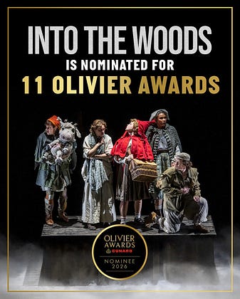 The terrific INTO THE WOODS currently playing at London’s Bridge Theatre receives 11 Olivier Award nominations. And HERE WE ARE scoops another 3. Hooray!