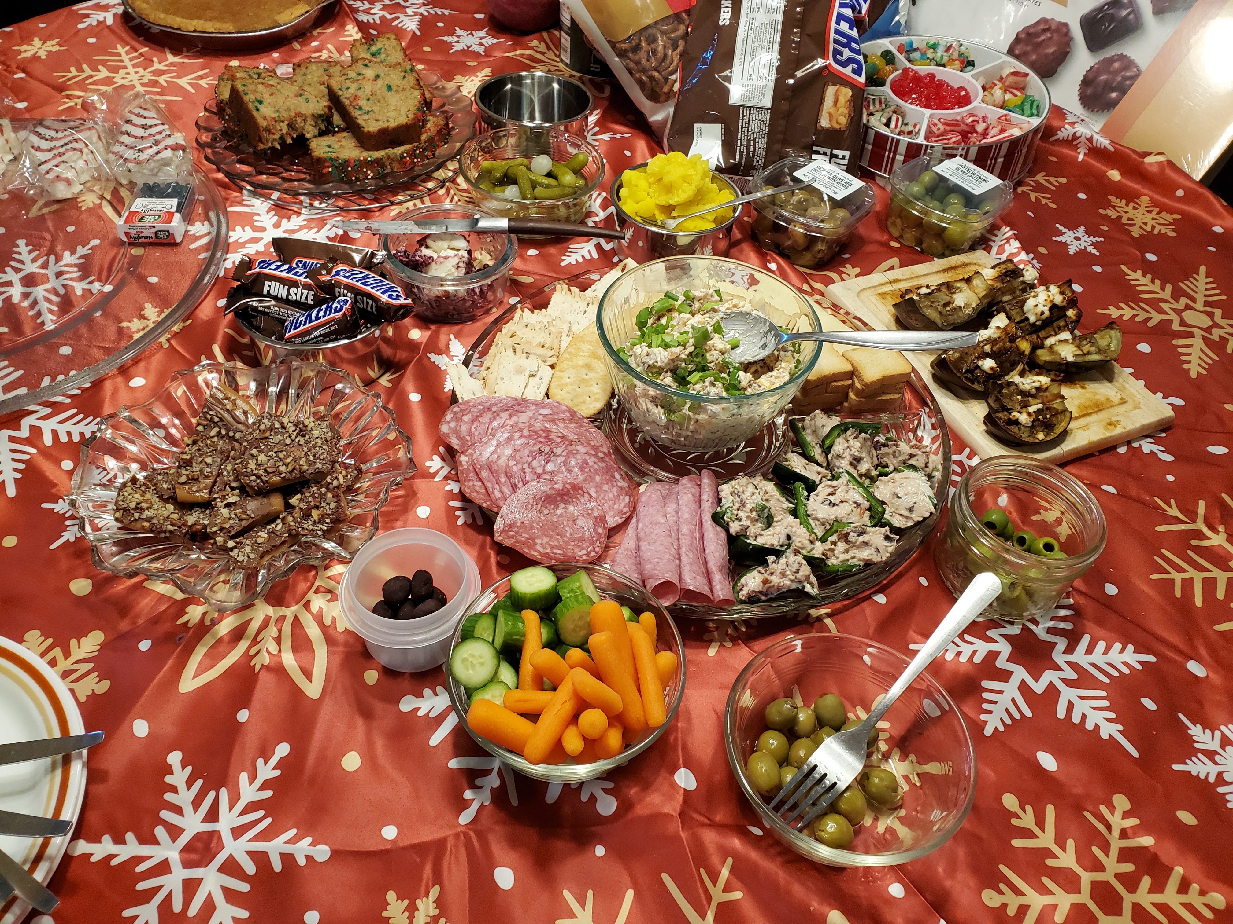 My relish tray/charcuterie tray. The eggplant was a huge hit (and it was super easy). Those came from our garden, as did the poblano chilis that I stuffed with a jalapeno cherry cheese mixture.