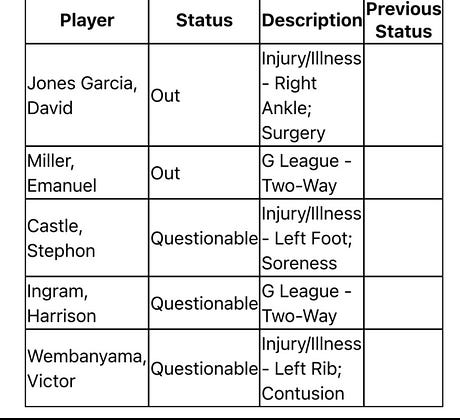 Per Spurs, Wemby is QUESTIONABLE to play Friday vs Dallas.