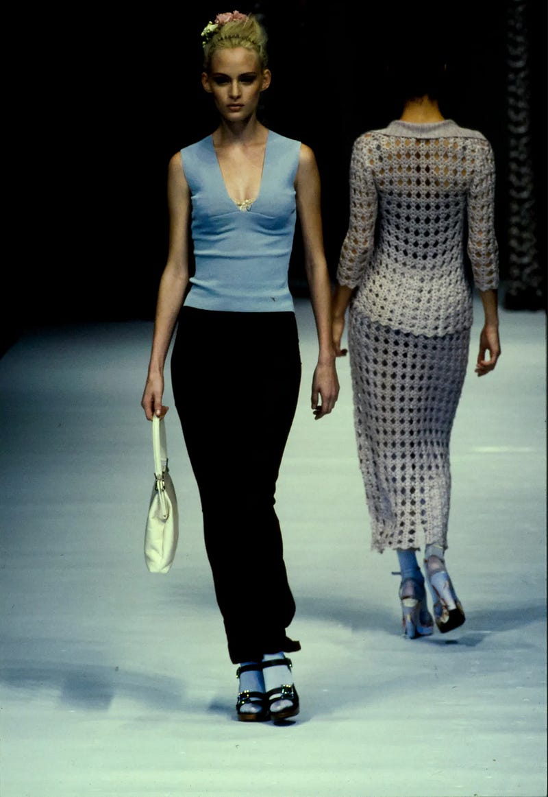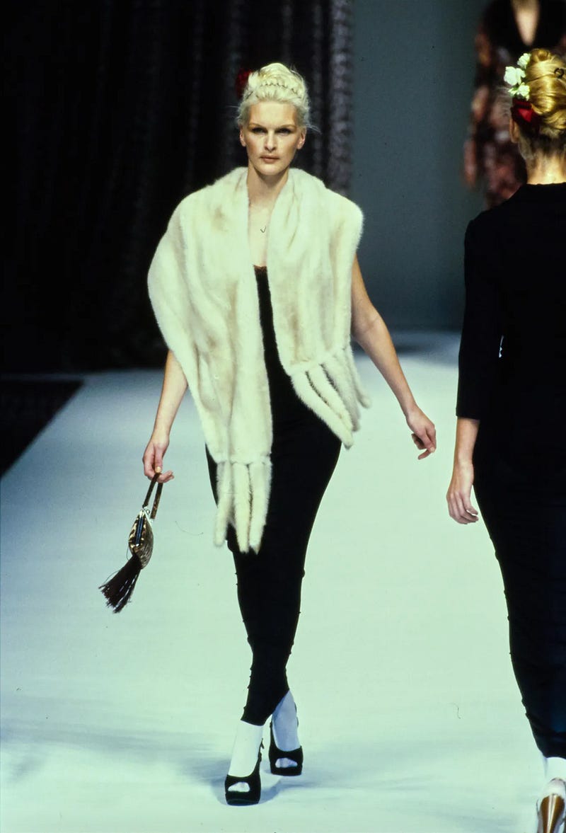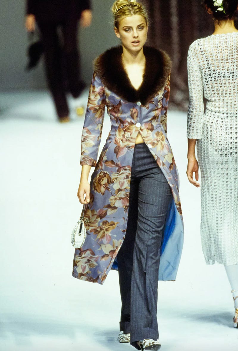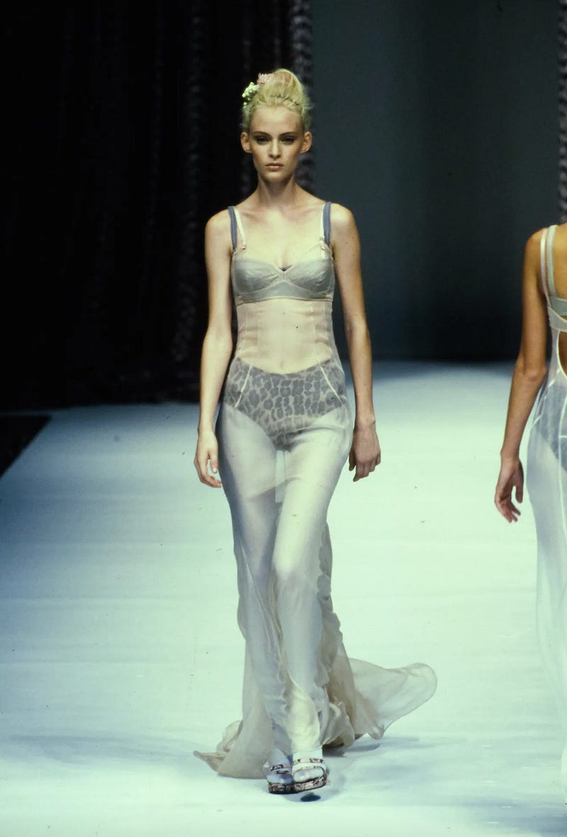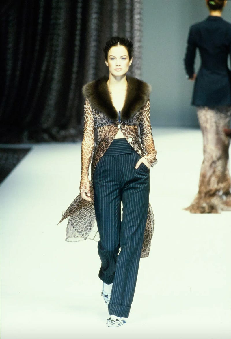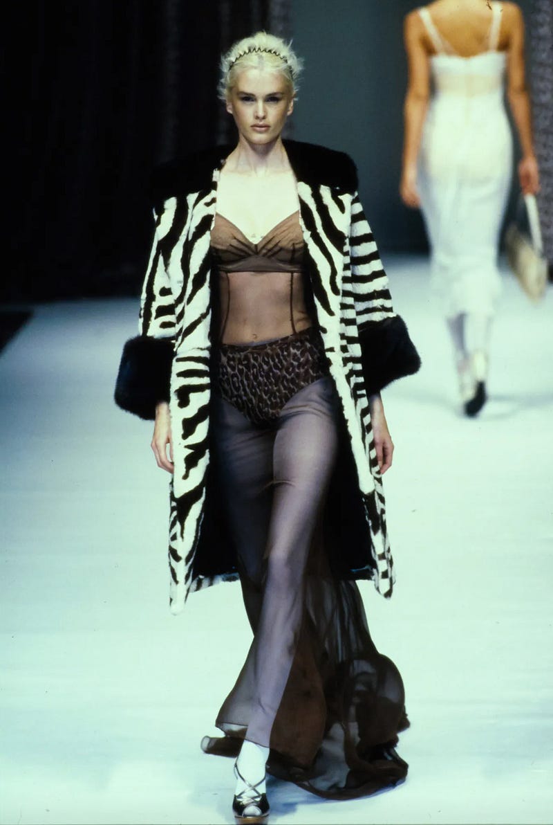 For all its outward signalling of sex, the collection feels unexpectedly cozy, with many prints seemingly lifted from the walls of a gradmother’s house. The sentiment tracks. Months after the show, Gabbana told the press that, to him, “clothes and furniture are inseparable.” The show ended with a parade of sheer slip dresses worn over leopard print lingerie.