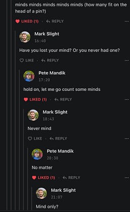 Pete Mandik is occasionally terse in back and forths in a way that annoys me (in the way I get annoyed at a very helpful but-not-in-the-way-I-want sales representative) but I do consistently chuckle at my interactions with him more than almost anyone else. He also reminded me of the best color for a banana to be.