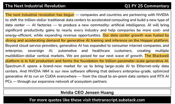 $NVDA CEO: "The next industrial revolution has begun..Our data center growth was fueled by strong & accelerating demand for Gen AI training & inference on the Hopper platform...Blackwell platform is in full production & forms the foundation for trillion-parameter-scale Gen AI"
