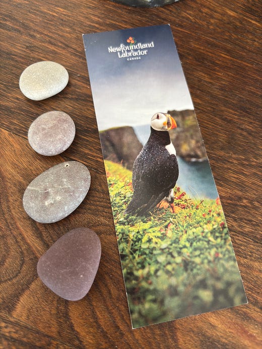 There’s a little bag of rocks and sea glass on the bookshelf right over there – I haven’t a clue where it came from. But it is sitting beside a little canning jar full of very smooth rocks that I picked up at various beaches in Newfoundland last summer.