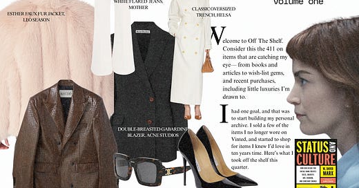 introducing off the shelf: a curation of what I’ve consumed this quarter — from clothing for my personal archive and the book inspiring my next essay, to the article making me miss third spaces and the tv show that reminds me to appreciate yearning.