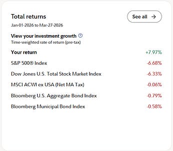 My retirement port YTD total return. Getting sadder and sadder. In my defense, and due to other business concerns over the last two months, I have had to substantially reduce my day trading of these accounts. I would have been up way more, I swear!