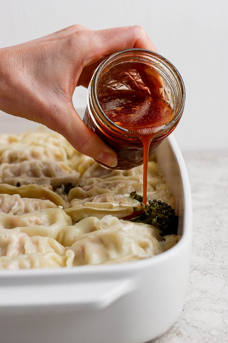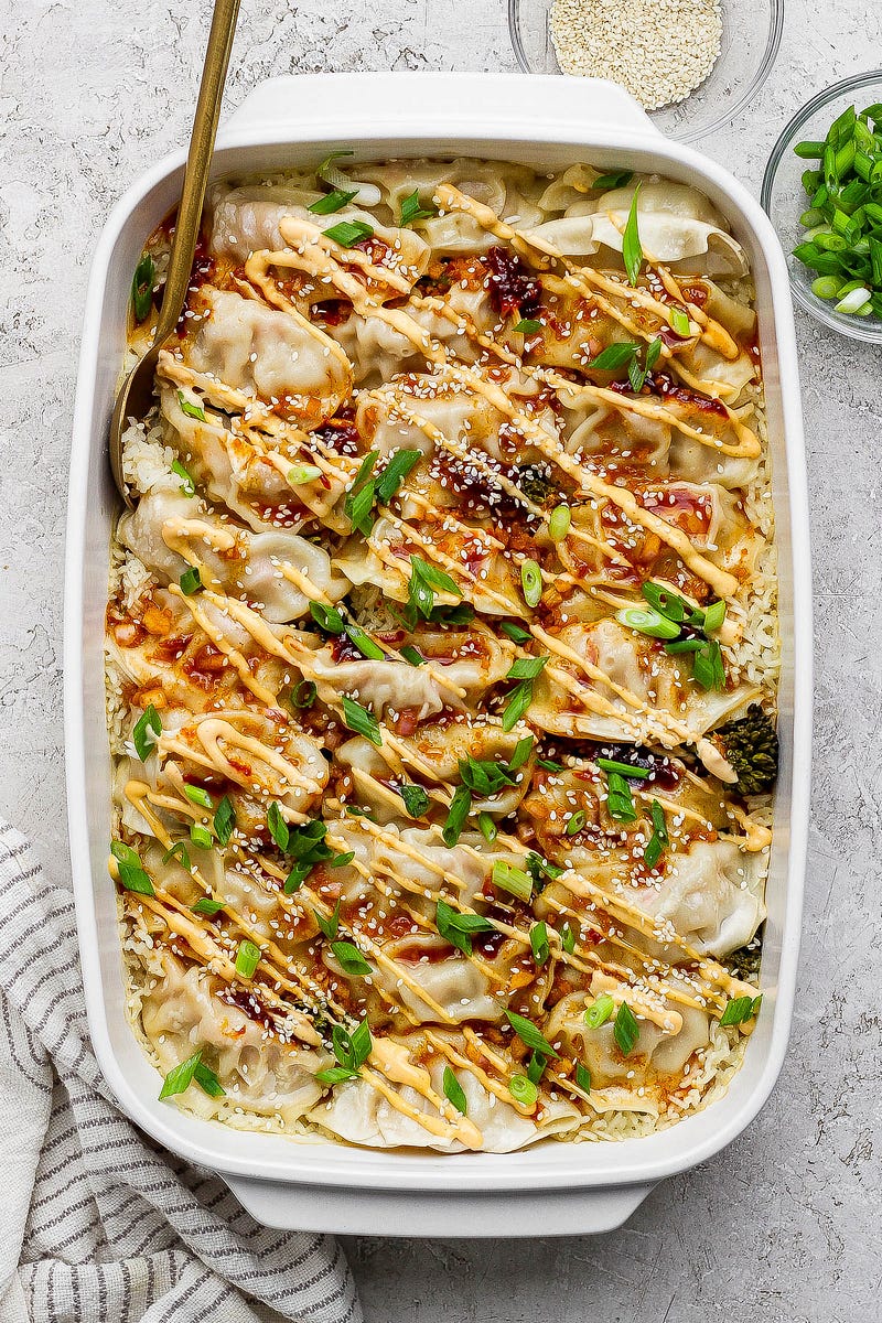 We have a new Dumpling Bake recipe on the site today! A one-pan dinner with rice, dumplings (potstickers), broccolini, soy ginger sauce and spicy mayo!
