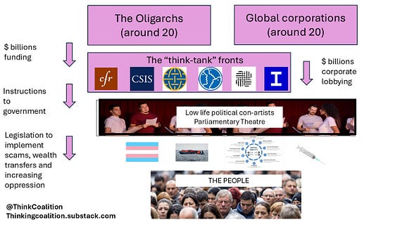 This is my latest iteration of the same message that I (and others) have been making for years and that is the “Western democracy” is a façade and societies are run by a central and predatory oligarchy made up of roughly 20 wealthiest oligarchs and 20 largest global corporations (a permanent feature of most societies). The oligarchs fund the production of the polices they want via a network of “think tanks” and the large corporates lobby (USD 4.4 billion in US per year) to get these passed and shuffle actor-politicians around. This is the only way you can explain the simultaneous passage of bizarre legislation (mandatory vaccination) in diverse countries when those polices lack any popular support. It never ceases to amaze me how morally bankrupt and treasonous the political and media class is, they will just push the talking points they are given (safe and effective) to camera and don’t seem to give a tinker’s cuss about the cost to their voters (including death). As we saw after COVID, faithful servants to this crooked system are taken care of with cushy jobs and gongs all around (yuk!). I made a short video about all the cash flows involved up and down the system (I think it needs more love) and should be taught to everyone at school so that young people go into life knowing that they are in a permanent tussle with an oligarchy that must be kept in check - Rumble link attached.