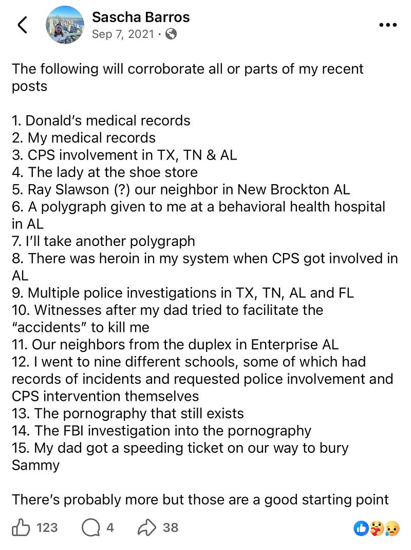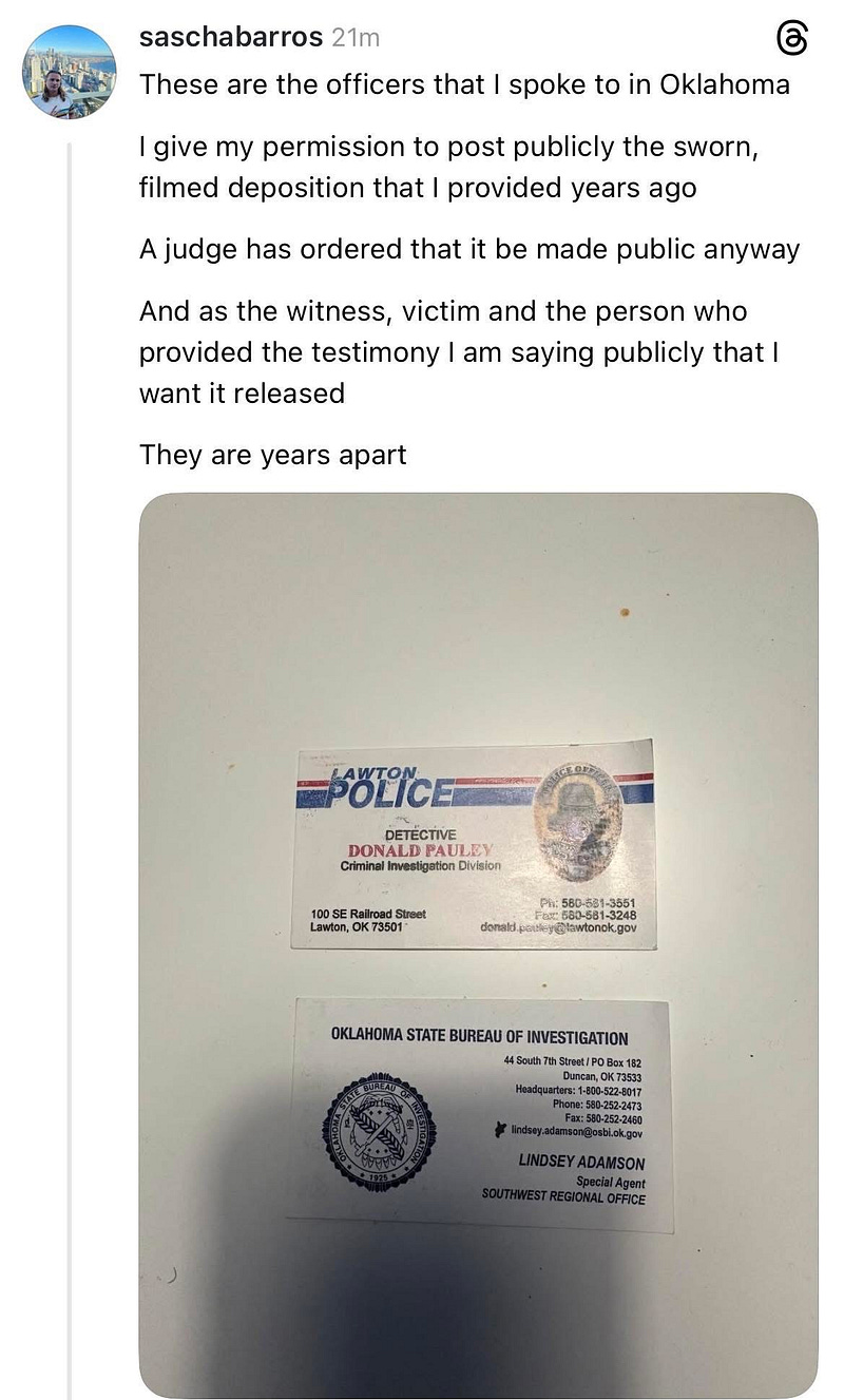 Sascha’s social media accounts are set to public, and they have been posting on Threads as recently as today. Their DD-214 has been verified. They have filed multiple police reports and stated that they are willing to testify and undergo additional polygraph examinations.