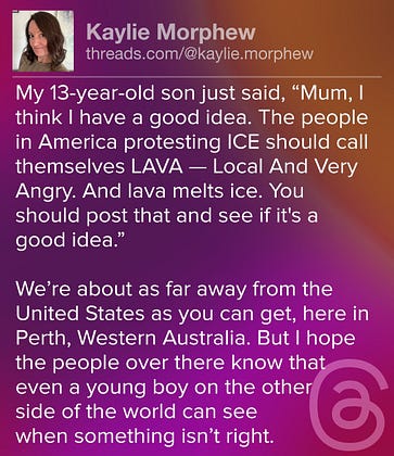 My 13-year-old son just said, “Mum, I think I have a good idea. The people in America protesting ICE should call themselves LAVA — Local And Very Angry. And lava melts ice. You should post that and see if it’s a good idea” We’re about as far away from the United States as you can get, here in Perth…
