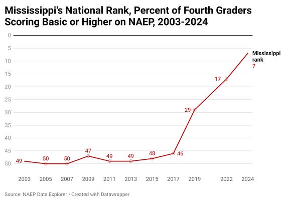 Here’s your chart of the week. Mississippi ranked almost dead-last in the share of students with foundational literacy skills until 2017. Now, it ranks 7th. How is that even possible?