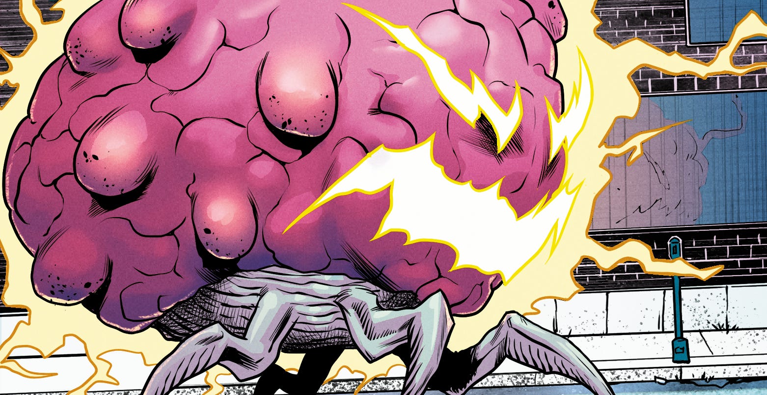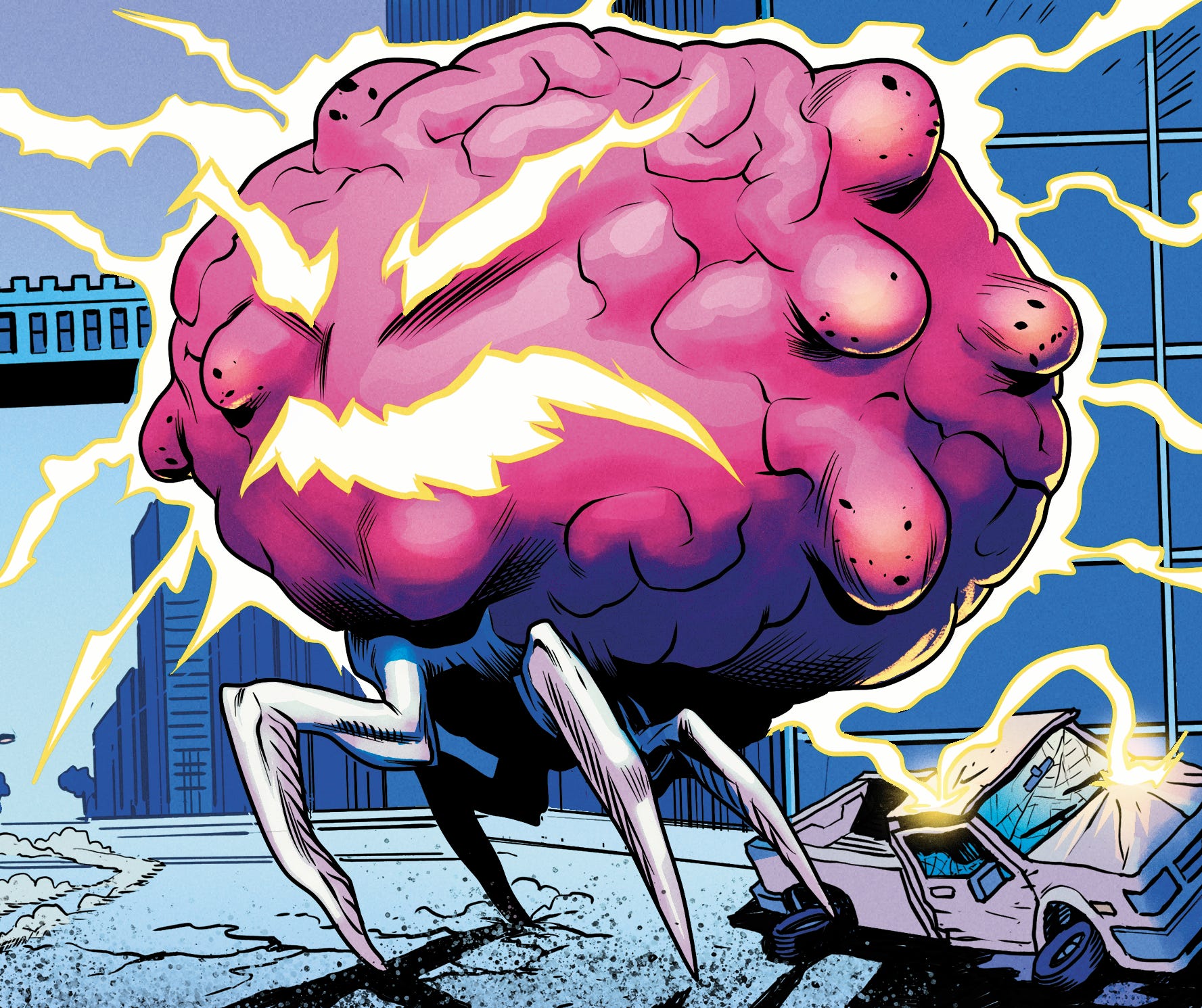 Smashing from his containment vat, this bubbly, oozy giant flying brain is grotesque but also a little goofy (in a M.O.D.O.K. sort of way). An inscrutable force of nature this monstrous giant brain rampages through Chicago, squirting out gooey minions and lightning blasts. And it seems only the telepathic fish-boy Lum can make the connection the brain is looking for…