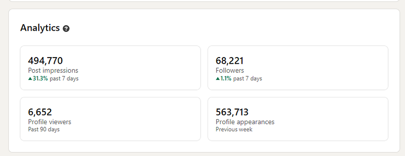 The first image is my 7 day LinkedIn analytics. 500,000+ impressions.