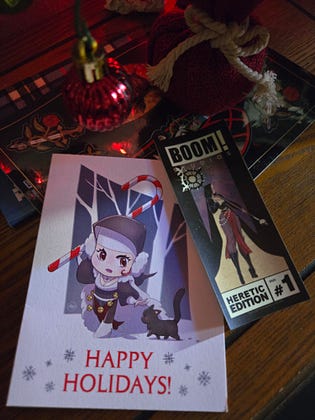 Happy Holidays and cozy Solstice from me and this adorable holiday card from the folks at Boom! Studios, featuring our lady Sister Marian Heretic! Joe draws the cutest little chibi-style Marian, and I was so glad Boom! put her on their card.