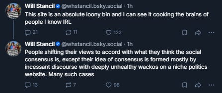 “The Network Effect” keeps people on platforms because their friends, social circle, neighborhood businesses, etc, are there. It’s kind of a pain in the ass to migrate, so the only people willing to migrate to a blatantly partisan platform are the blatantly—obsessively—partisan people. That they’re winding each other up and driving each other insane isn’t just predictable, it’s inevitable.