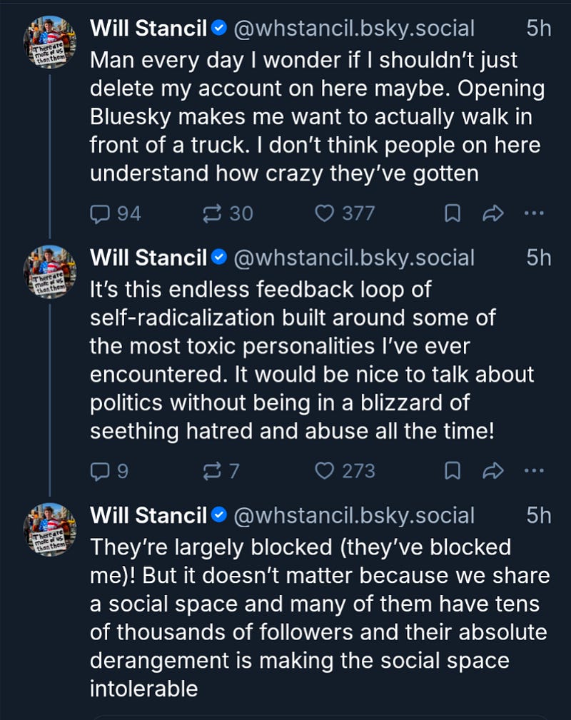 But I told him at the time it was a mistake. When I’d popped into Bluesky it had the same vibe as Truth Social or Parler (that other right wing social media site that the lefties got shut down via AWS), which is to say it was a purified version of political lunacy.